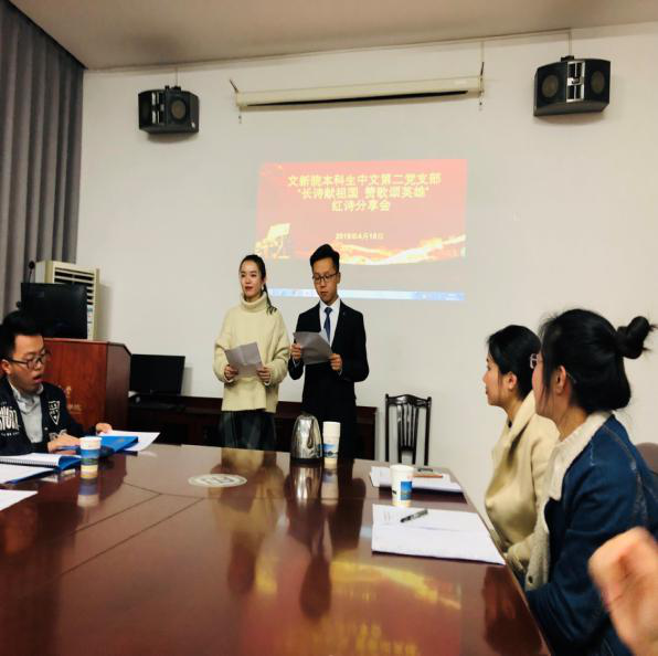 4月15日晚上,文新院本科生中文第二党支部在文新院230会议室组织召开学习余元君同志先进事迹和红诗朗诵活动。支部党员、院党委书记罗军飞同志参加会议,会议由支部书记李联凯主持。