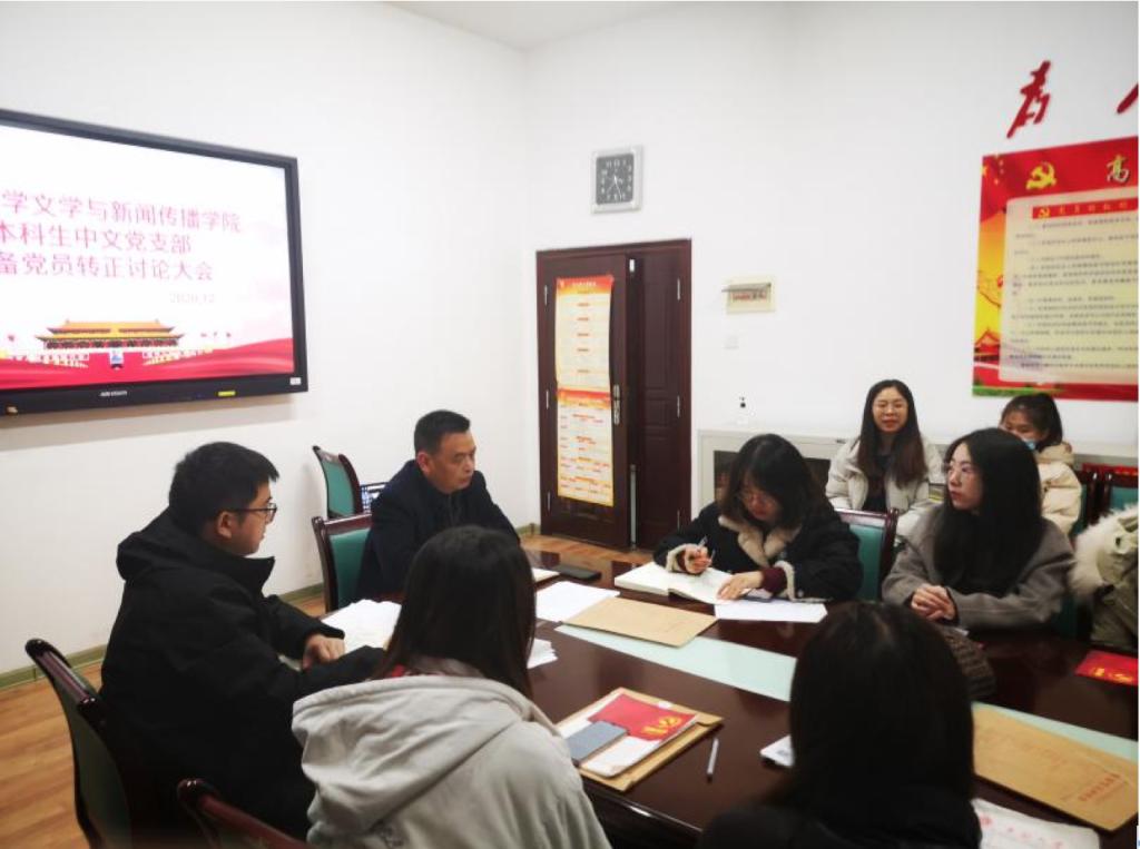 2020年12月20日,本科生中文党支部于文法楼234会议室召开支部大会,就支部预备党员转正等事宜进行讨论。会后,为趁热打铁提升新转正党员同志思想水平,增强支部活力与战斗力,发挥支部战斗堡垒重要作用,党委书记罗军飞同志开展了以“用习近平新时代中国特色社会主义思想武装自己,做新时代合格大学生共产党员”为主题的专题党课讲授。本次活动由支部书记易孝慈同志主持,支部全体党员参与此次会议。