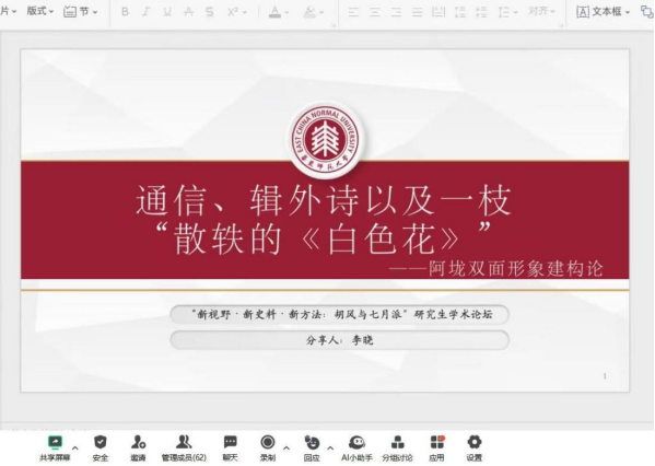 论坛第六组由湖南师范大学文学院许永宁老师主持,华中科技大学tapplay官网李雅娟副教授进行评议。tapplay,tapplay官网马迎春指出了一个吕荧研究中的现象,即吕荧极力批判的观念论反而成为了其自己的美学标签。tapplay,tapplay官网易可心对1946年至1955年曾卓诗歌创作的中断期进行研究。日本国立名古屋大学中国语中国文学专业胡胜重新考察1938年武汉文坛围绕旧形式利用所展开的论争,并明确这场论争在中国现当代文学史上的意义。