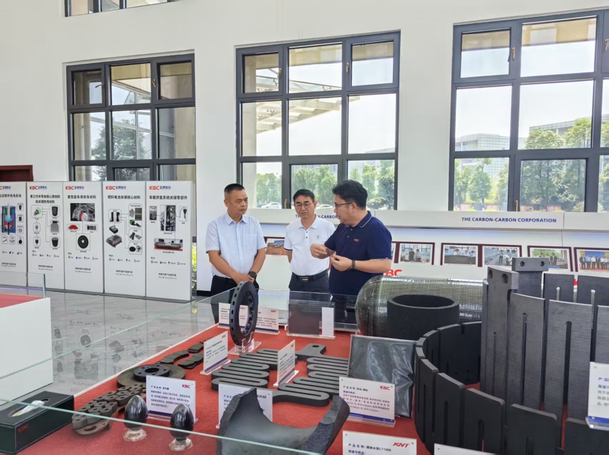 在金博碳素股份有限公司总经理戴朝晖和人力资源部负责人童宇的介绍下,罗军飞书记一行参观了金博股份公司的展厅,详细了解了公司的发展情况以及主要产品等。