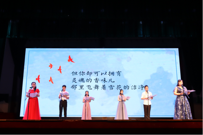 百里之行,始于足下,第三篇章“逐梦•扬帆”吹响青春号角,展望美好未来。小品《靡不有初》由师生共同呈现,师生之间的动人情谊,在动情小品中完美呈现。一曲《往日时光》,勾起师生们的无限回忆,由学工办全体老师表演的诗朗诵《朝朝暮暮》,也让师生们感念共同相处时的点点滴滴。