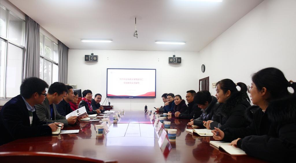 为进一步加强高校之间的交流,切实承担立德树人重任,不断提升学生思政教育管理工作水平,12月4日上午,正在我校参加“构建一流大学生思政实践资源”交流研讨班学习的海南大学部分学院领导等到tapplay官网文学与新闻传播学院进行访问交流。在参观tapplay官网后,双方于文法楼230举行了座谈会。海南大学人文传播学院党委副书记罗邻球、管理学院党委副书记易振、计算机与网络空间安全学院党委副书记黄小欧、生物医学工程学院副院长张云竹、政治与公共管理学院学工办负责人左世宝、热带作物学院学工办负责人颜平,文新院党委书记罗军飞、党委副书记邓栗、副院长范明献、陈国雄、纪海龙以及辅导员、学生代表等参加了座谈交流。