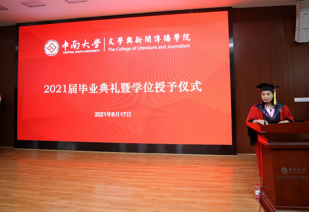 典礼在庄严的国歌声中拉开序幕。院党委书记罗军飞宣读文学与新闻传播学院2021届优秀毕业生、毕业生单项获奖名单,并与其他院领导为获奖代表颁奖。副院长范明献、陈国雄宣布授予博士、硕士、学士学位毕业生名单。在学位授予环节,各位教授先后为毕业生拨穗正冠,颁发学位证书,进行合影留念。