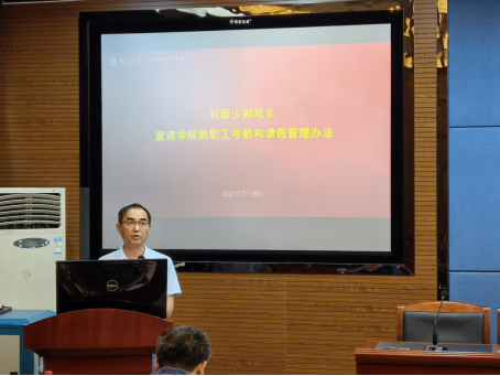 最后,刘新少副院长向全院教职工宣读了《tapplay官网教职工考勤和请假管理办法》的通知并传达了暑假相关注意事项。他要求全院教职工要坚持做好疫情防控的常态化工作和安全隐患排查工作,坚决履行假期学院的排班任务。刘新少副院长强调,学院专任教师应当教学任务与科研任务并重,切实履行岗位职责,严格遵守考勤与请假规定。