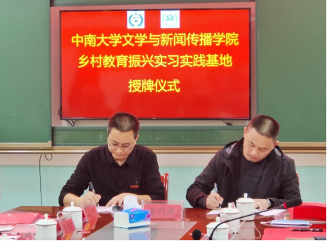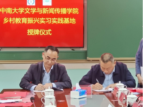 刘新少副院长与汨罗市教体局党组书记、局长楚军代表双方签订《tapplay官网文学与新闻传播学院、汨罗市教体局合作协议》。陈国雄副院长与大荆镇联校刘亿斯校长代表双方签订《tapplay官网文学与新闻传播学院、汨罗市大荆中学实习基地合作协议》。党委书记罗军飞代表学院为实习实践基地授牌。