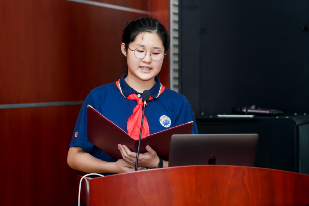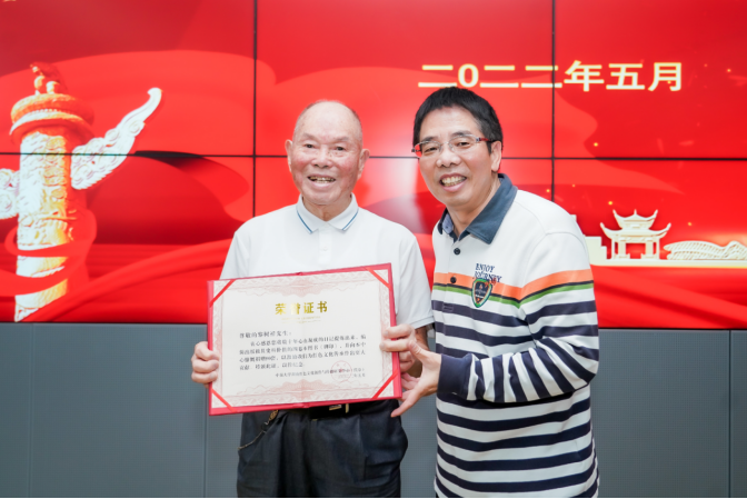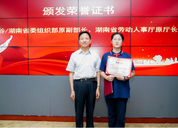 捐赠结束后,长郡外国语实验中学、长沙市十佳少先队员朗诵了聂茂教授的诗歌作品《红色精神的火焰》,湖南省委组织部原副部长彭崇高向陈宴琳同学颁发了荣誉证书。