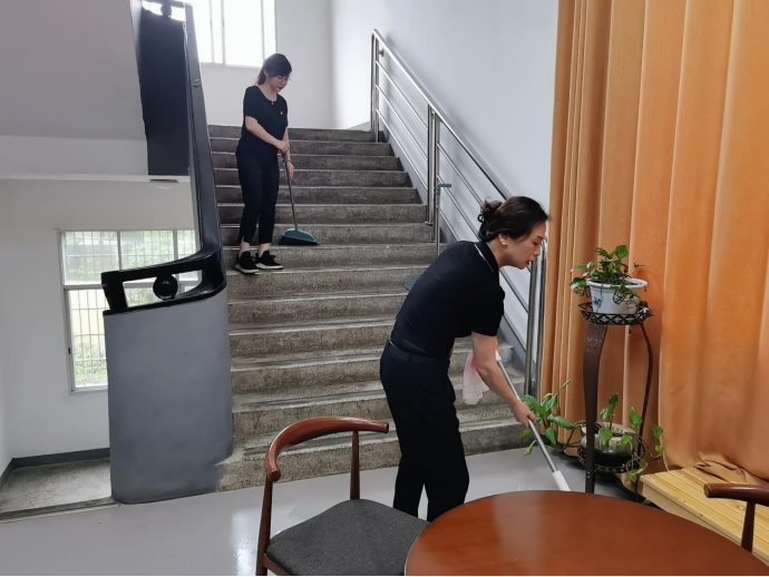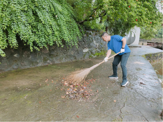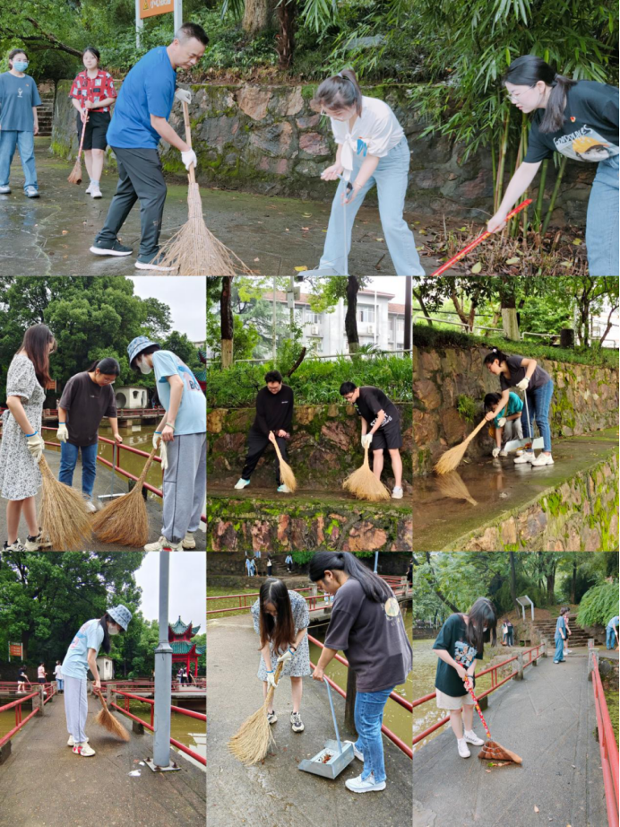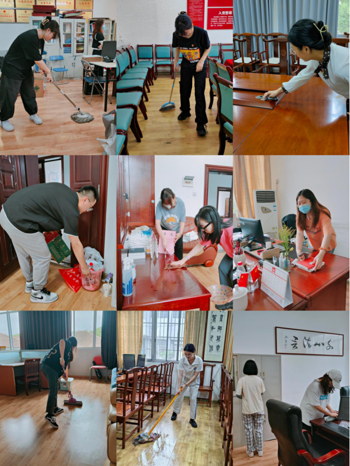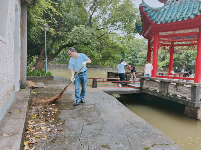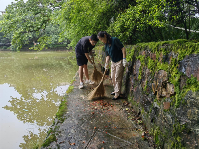 在全体院领导的带领下,所有行政人员及毕业生党员有序领取清扫工具,积极参与到各自区域的清扫中。半月湖、紫藤长廊、林荫道以及文法楼的各间办公室,处处可见党员师生认真清扫的身影。他们分工合作,互相帮助,仔细地清扫和捡拾垃圾,归整残枝和落叶,擦拭桌椅与地面。一个小时左右,整个半月湖区与文法楼便焕然一新。“能以这样的方式为母校做贡献,我感到很骄傲,也在劳动中越发不舍和留恋母校。”毕业生党员在劳动中感慨道。