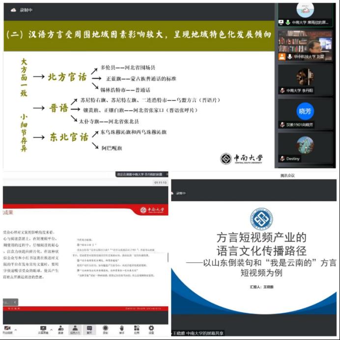 另有3名同学在分论坛五“区域语言服务研究”进行报告:李丹阳《县域文旅产业网络宣传文案研究——以泗洪县洪泽湖湿地为例》;席雨欣《锡盟语言资源的保护与开发问题研究》;王晓雅《方言短视频产品的语言文化传播路径——以山东倒装句和“我是云南的”方言短视频为例》。
