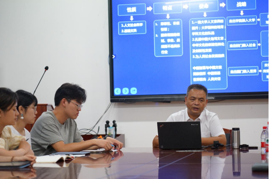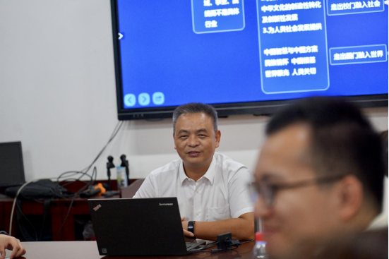 在授课的第一阶段,罗军飞书记从性质、特点、使命、战略等多个方面介绍了学院关于学科发展路径的认识与思考,并重点就扎根中国大地办大学的学院学科发展使命进行了具体阐释。首先,扎根中国大地办大学首先需要扎根湖南办大学,需要充分吸收当地的文化养分;其次,扎根中国大地办大学需要扎根中国大地写文章;再次,扎根中国大地办大学需要始终坚持为人类命运共同体贡献中国智慧和中国方案。
