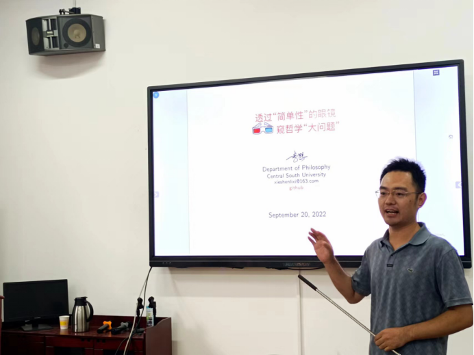 哲学系李熙副教授为在场青年教师带来一场名为《透过“简单性”的眼镜窥哲学的“大问题”》的分享。李熙副教授从一个大家耳熟能详的故事“地主家的傻儿子”引入,说明“简单性”不简单,又延伸至柯尔莫哥洛夫复杂性,对其“简单性”的刻画进行了讲解,又谈到了所罗门诺夫通用归纳,对“休谟问题”进行了探讨。探讨了数学问题,李熙副教授又深入至哲学问题:世界的规律/简单性从何而来?李熙副教授就此对康德和马克思的“简单性”的相关理念进行了基本介绍,又由此上升至人生意义。