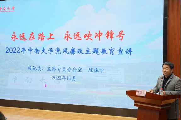 陈振华将理论知识与典型案例相结合,以“永远在路上,永远吹冲锋号”为主题,带领大家准确把握全面从严治党新形势,正确看待当前高校存在的共性问题,深刻理解监督与被监督的关系,陈振华强调,要讲政治、讲团结、讲担当、讲发展、讲廉洁,他号召,大家要以党的二十大精神为指引,以更高的站位、更严的标准鞭策自己,争做新时代忠诚担当廉洁标杆。