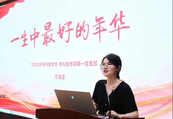 培训会上,本科生传媒第一党支部组织委员兼纪检委员何淇滢与硕士生教育学党支部书记张浩翔以微党课的形式,为同学们作优秀党员先进事迹报告。何淇滢同志的微党课以“一生中最好的年华”为题,用习近平总书记在梁家河着手修建第一个修沼气池的故事和“七一勋章”获得者、“时代楷模”黄文秀的事迹带领同学们一同领悟青年党员为人民服务的使命担当。
