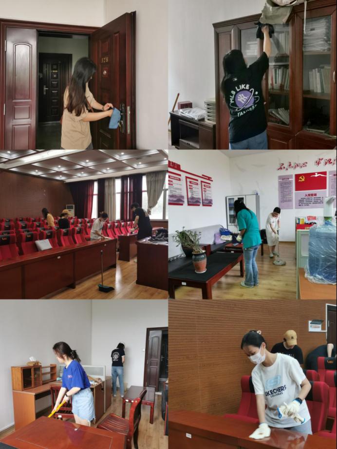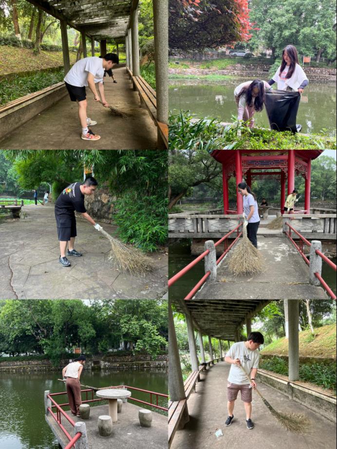 毕业生党员们有序领取劳动工具,迅速前往各自的清扫地点,毫无犹豫,绝不拖沓。从荷花池到紫藤长廊,从林荫道到健身区,从会议室到教室,文法楼内外各处皆有党员们辛勤劳作的身影。在良好的配合分工下,清扫工作各司其职,有条不紊,不留死角,进行得又快又好。道路草坪上的落叶、烟头、废纸屑等垃圾被一扫而净,会议室内的桌面椅背也被擦得锃亮反光。下午5点,随着最后一份劳动工具被整齐地还回归位,文法楼内外终于整洁一新。