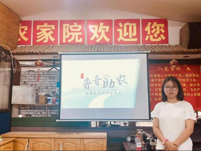上午10点,团队乘车到达锦州市苹果园。在鹿银江村长的帮助下,顺利开展了针对乡村主播的“网络营销话术分享会”。会中,推普团队的白宇光同学向各位村民介绍如何注册抖音、快手网店,向村民们介绍了四种最流行直播带货方式,分享了乡村主播的成功案例供村民们学习,并帮助村民了解怎样将“普通话+锦州方言”融合起来进行直播。