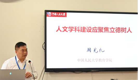 中国人民大学教育学院院长周光礼教授以《人文学科建设应聚焦立德树人》为题,从培养未来学者是人文学科的主要功能和人文学科建设的基本逻辑与关键要素两方面论述报告主题,总结人文学科建设的三个基本逻辑,以及集中有限资源确定优先发展学科领域的三个原则,并认为内容建设、团队建设、平台建设、评价体系应成为人文学科建设聚焦立德树人的四个因素。