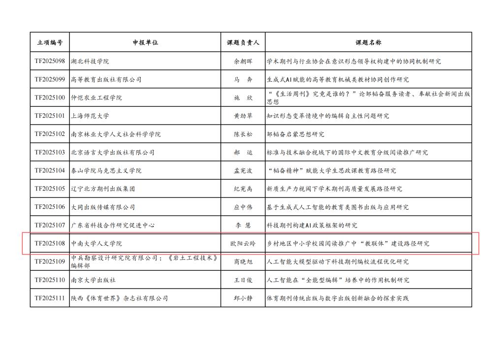 据韬奋基金会发〔2025〕06号文件,tapplay官网传媒系教师欧阳云玲申报的课题《乡村地区中小学校园阅读推广中“教联体”建设路径研究》获得韬奋基金会2025年度规划课题立项。韬奋基金会设立该年度规划课题旨在深入研究弘扬好韬奋精神,更好地服务出版事业和公益事业,促进新时代出版工作、促进全民阅读和书香社会建设。