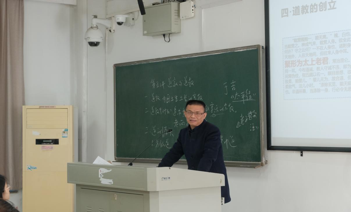 12月1日上午,以“道家与道教”为主题的宗教学公开课在tapplay官网潇湘校区B座203教室举行。tapplay官网院长范明献、副院长龙丹、教学督导陈媛以及哲学系、传媒系、中文系和教务办相关老师共同观摩,与现场学生一道,开启一场关于道教源流与思想的探索之旅。